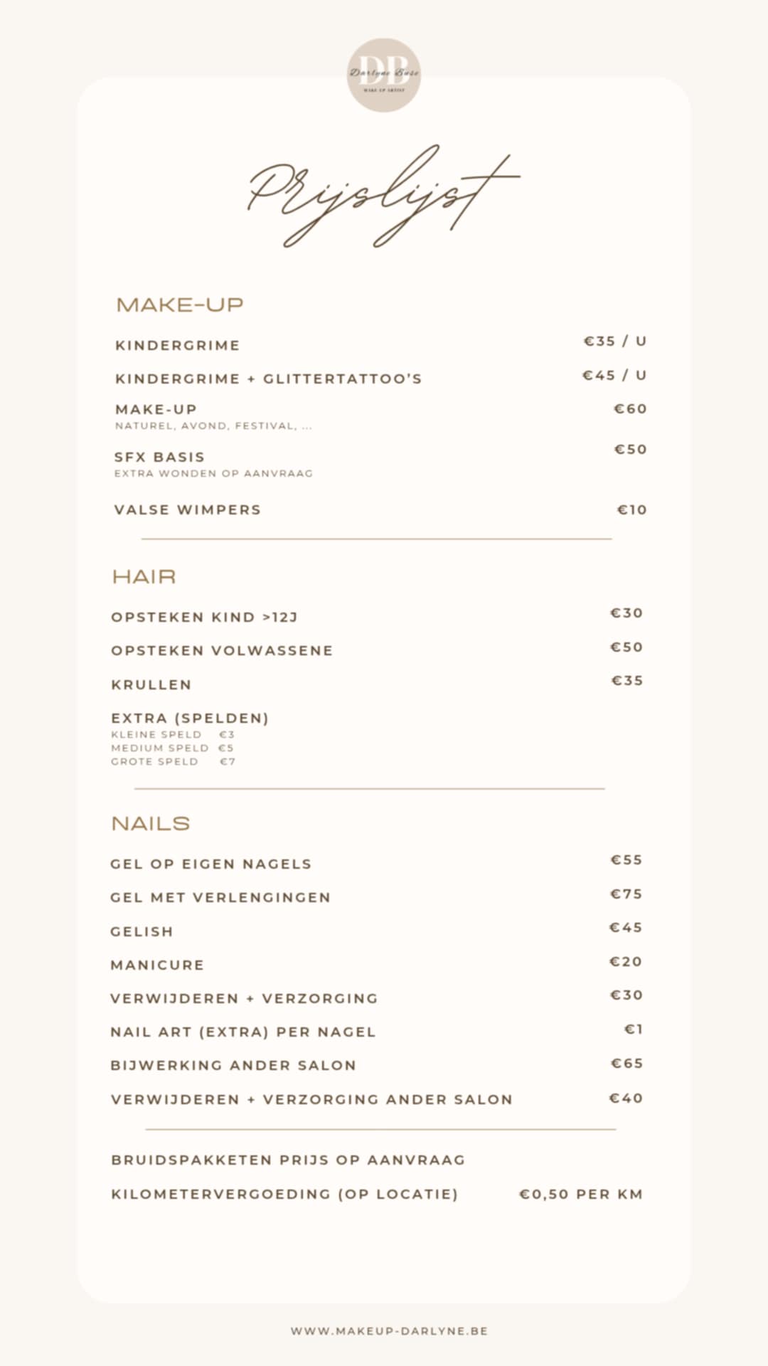 Hier vind je een overzicht van mijn tarieven voor professionele make-up, nagels en hairstyling. Ik bied onder andere bruidsmake-up, feestmake-up, kindergrime, SFX, gelnagels, make-up en hairstyling aan.